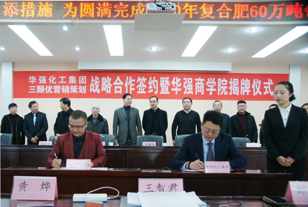 我公司副总经理、销售公司总经理赵迎春和三颗优营销策划公司总经理王智君共同为“华强商学院”揭牌,并为王智君、谢磊、邹刚、黄烨颁发“华强商学院”讲师聘书,标志着“华强商学院”正式成立。随后,营销员代表国成龙和磷复肥分公司总经理张华斌分别上台表决心,表达了销售公司坚决完成2020年销售任务的决心。