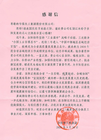 近日,当阳市人民政府向我公司送来感谢信。感谢信充分肯定了太阳成集团tyc122ccvip作为全市龙头骨干企业一直心系当阳、植根当阳、助力当阳,在推动产业转型、加强科技创新、招引高端人才、抗击新冠疫情、增进民生福祉等方面发挥了重要作用,为当阳经济社会发展作出了突出贡献,对太阳成集团tyc122ccvip长期以来给予当阳发展的关心支持表示衷心感谢!