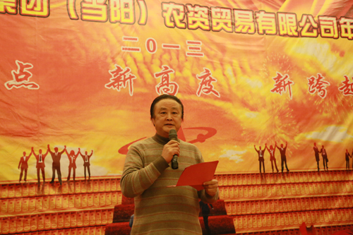 周总在致辞中对2012年的销售工作进行了回顾,并对2013年目标30万吨的复合肥销量勾画了一个清晰蓝图。他说,2012年销售公司经历和克服了市场起伏变化较大、客户经营心态浮躁、观望心理严重、市场竞争更加激烈的困难,取得了华强复合肥南北市场第一年战役的全面胜利,创造了仅用220天就销售15万吨复合肥的行业奇迹。他感谢业务员在这一年的艰辛付出,感谢家属在这一年的背后支撑,感谢各位领导为销售工作所做的服务和协调,感谢董事长提供了一个可以施展抱负的平台。新的一年,挑战与机遇并存,农贸公司将以董事长的重要思想来指导销售,以日益健全、完善的管理制度强化管理,凝聚各方智慧,要全速推进2013年的复合肥销售目标,在30万吨复合肥销量总目标的激励下,增强公司产品的市场竞争力,要形成强大的攻坚合力!新的一年,农贸公司将根据市场的实际需要,加大新产品生产力度,着力打造华强新品特色,积极谋求更大的发展,实现华强复合肥投产次年就翻番的销售新指标!